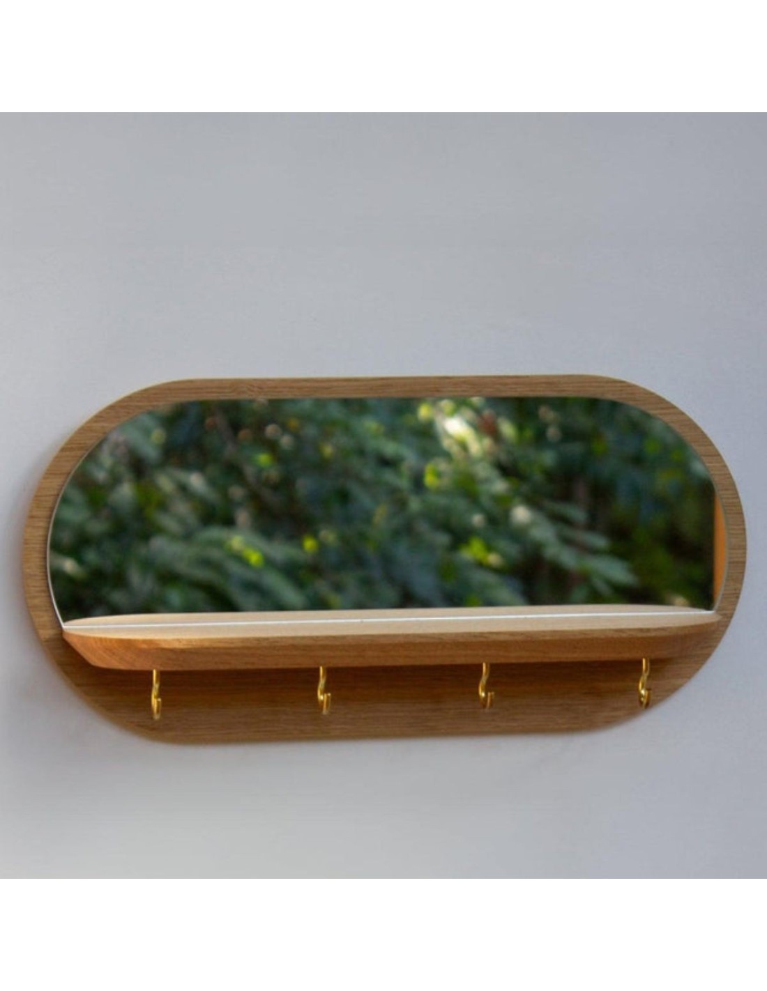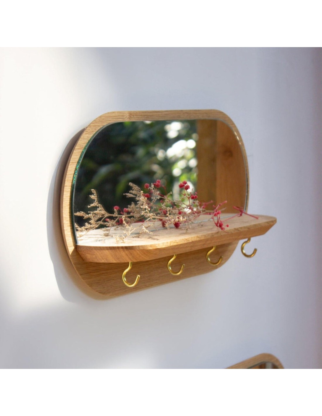 Miroir en médium plaqué chêne avec tablette en chêne massif (bois Français issu FGD*) et miroir en verre sans cuivre.