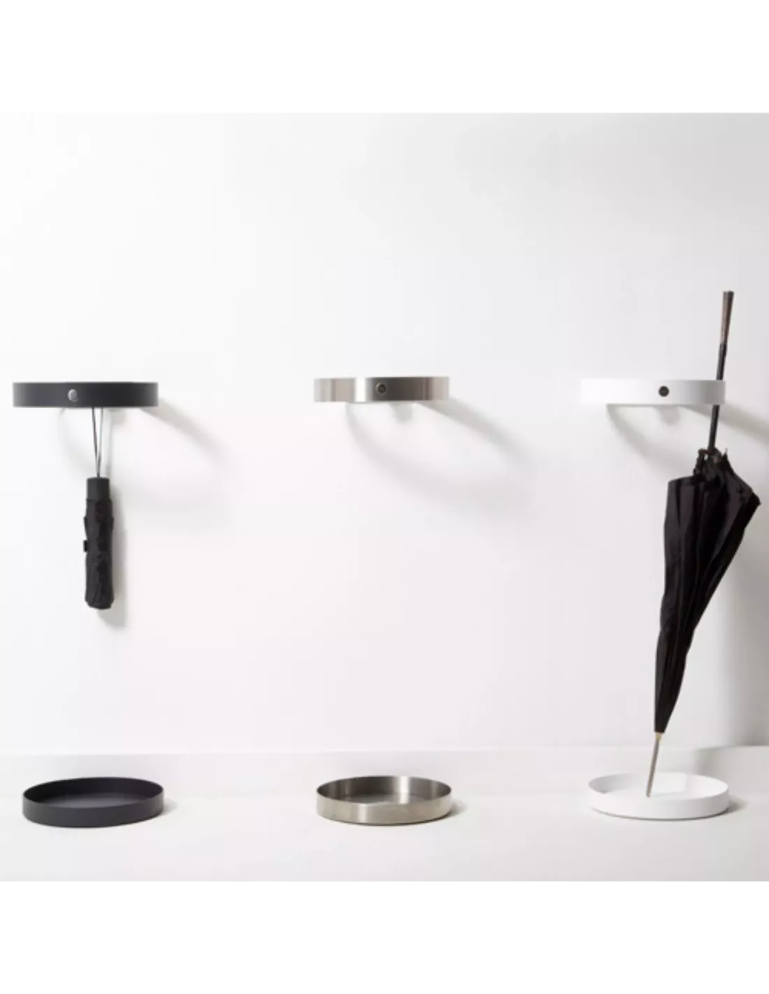 Fixé au mur, l’anneau peut accueillir tous types de parapluies-cannes, tandis qu’un crochet en forme de trompette est prévu pour les parapluies pliables.