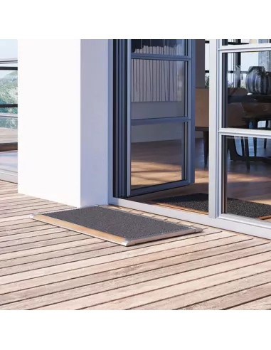 Paillasson d'extérieur réalisé en aluminium aux finitions très soignées, il est garni d'un tapis brosse de qualité professionnelle. Présenté ici dans sa version bi-matières (teck et aluminium anodisé) et en dimensions 90 x 60 cm.