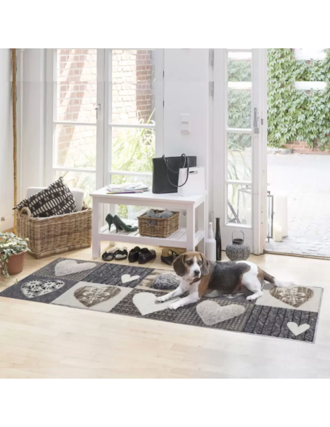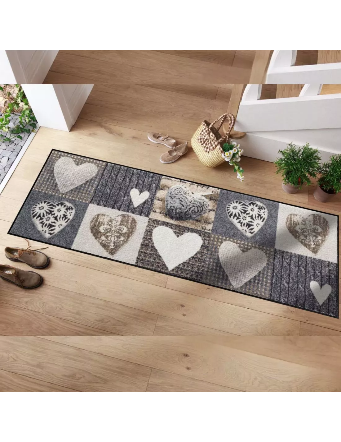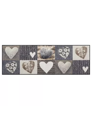 Le tapis couloir Farandole de Cœurs 60x180 cm de Salonloewe évoque l'évasion marine avec ses motifs cœurs galbés en tons beiges, gris et sable, idéal pour habiller longuement halls et couloirs étroits.