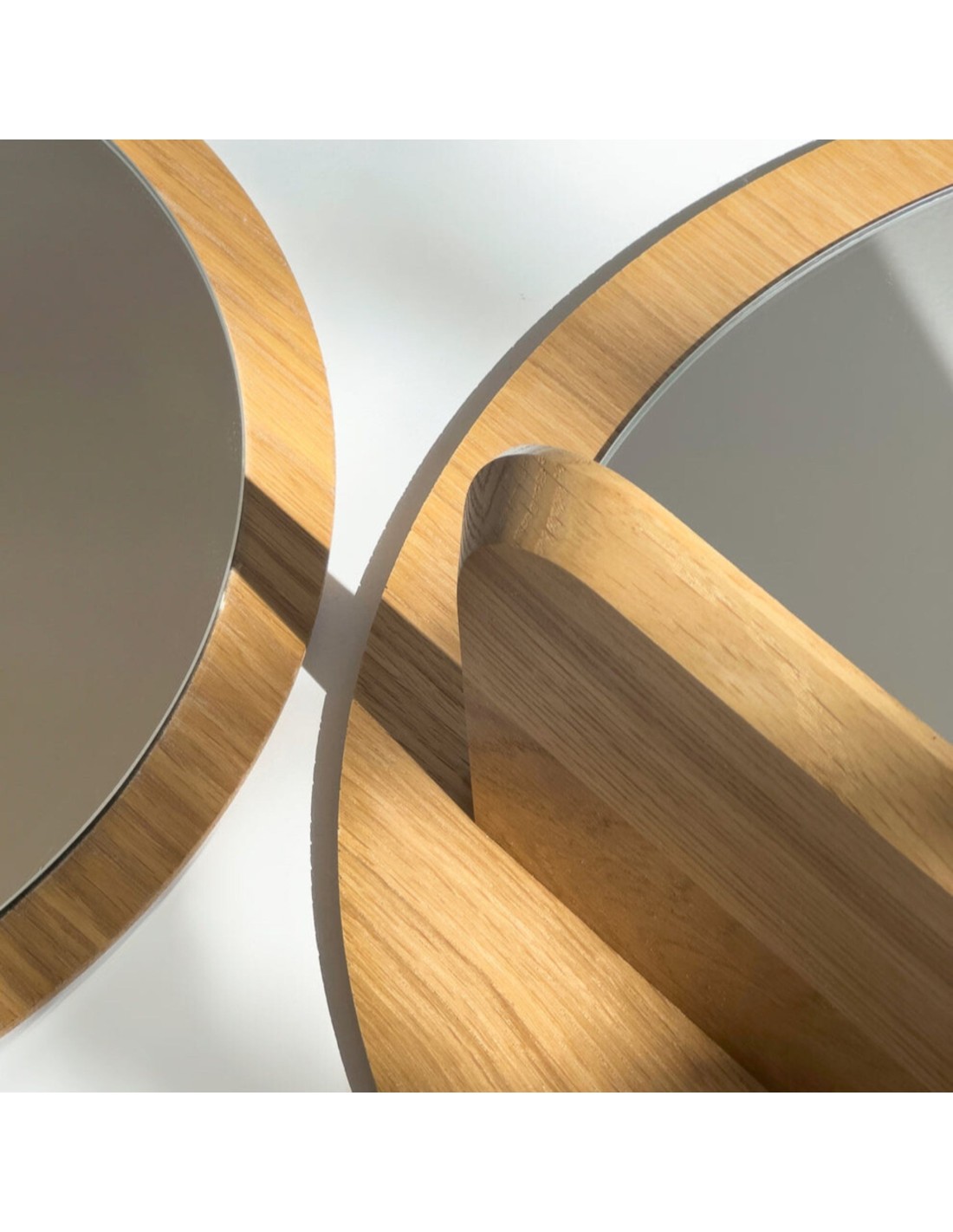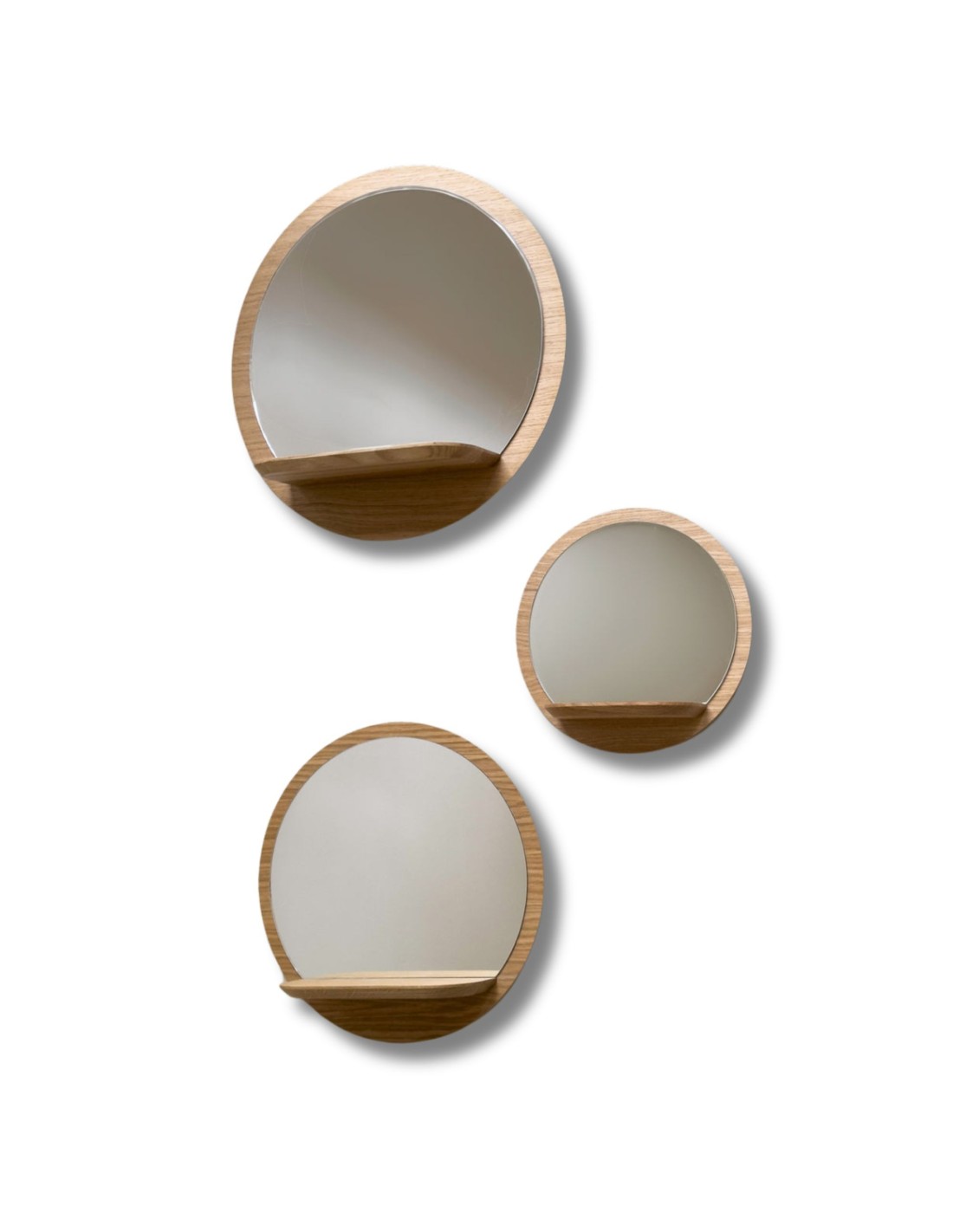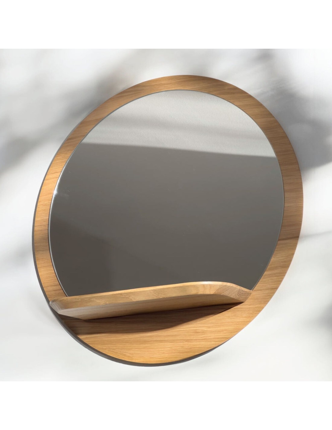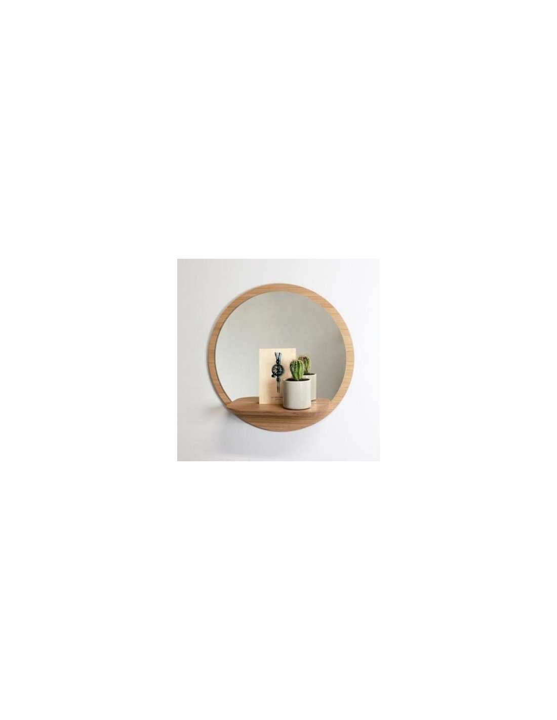 Le miroir mural rond en Bois avec petite étagère Sunrise taille M de la marque française Reine Mère est un élément particulièrement utile dans une entrée.