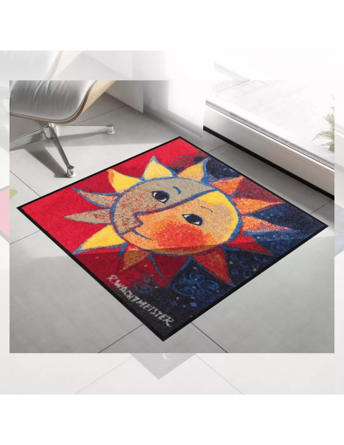 On distingue en effet sur le soleil de ce tapis d'entrée carré design un visage à gauche qui nous regarde de face tandis que se dessine à droite un profil humain avec un nez, une bouche et un menton.