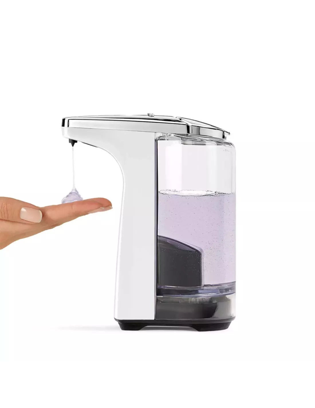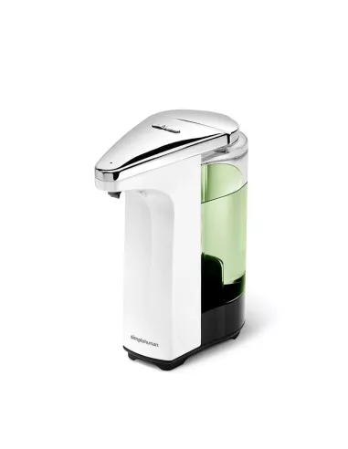 Découvrez le distributeur de savon automatique blanc Simplehuman, un modèle compact et performant au design nickel mat sobre et élégant, parfait pour la cuisine, la salle de bain ou les toilettes.