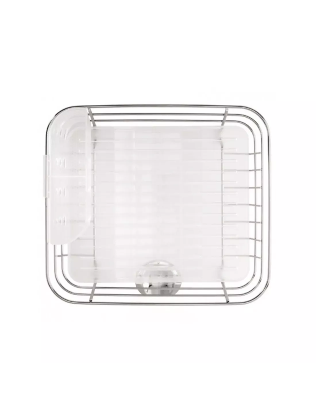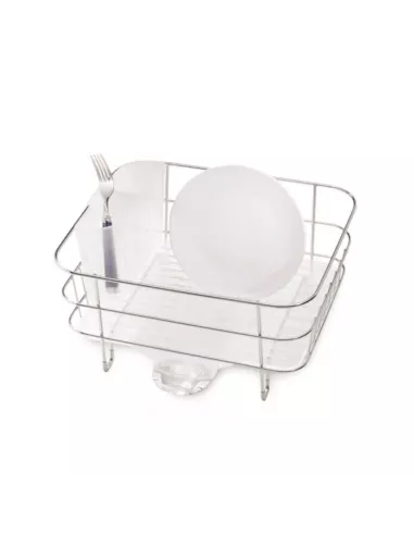 Découvrez l’égouttoir compact Simplehuman, en acier inoxydable et fond blanc, pensé pour les cuisines modernes.