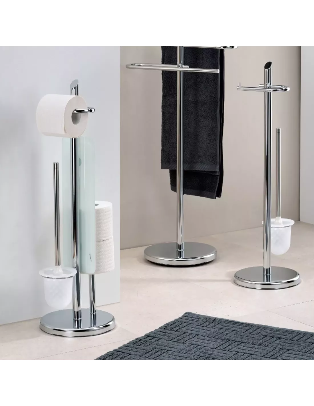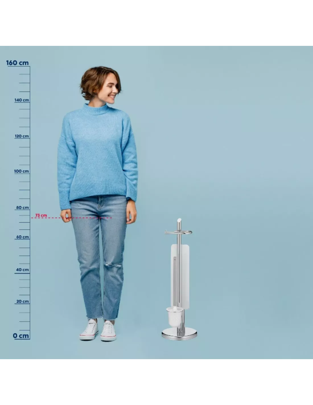 Sa base ronde de 22 cm de diamètre assure une bonne stabilité, tandis que la hauteur d’environ 73 cm permet une prise en main confortable sans encombrer l’espace, ce qui le rend particulièrement adapté aux petites salles d’eau ou WC indépendants.