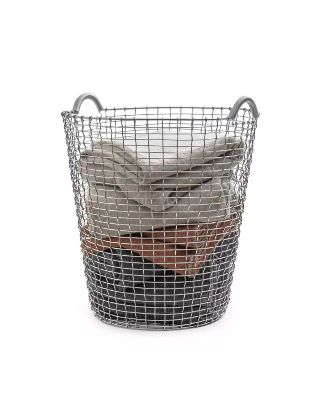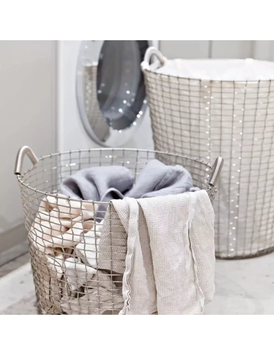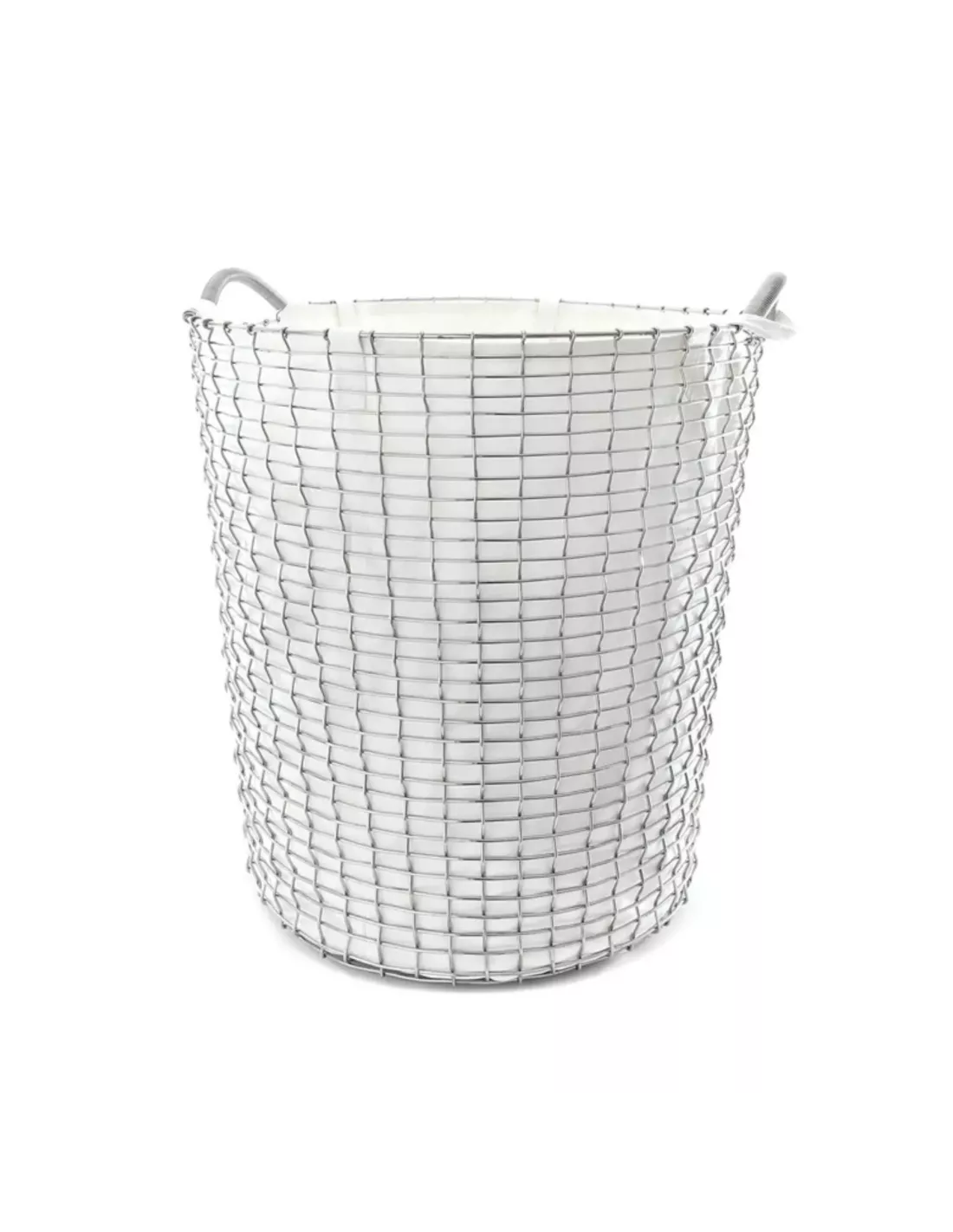Cette corbeille à linge sale de la société suédoise Korbo est réalisée en acier galvanisé (plus terne que l'acier inoxydable).