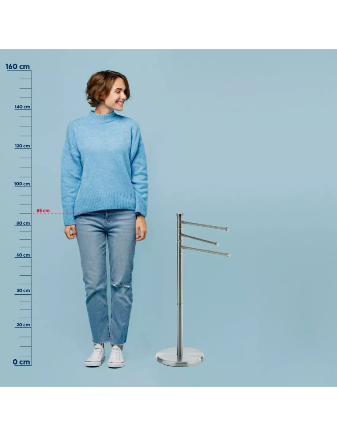 Compact avec une base ronde de 28,5 cm de diamètre et une hauteur de 85,5 cm, il s'intègre parfaitement dans les salles de bain sans fixation murale, offrant une grande stabilité et une capacité pour trois serviettes simultanément.