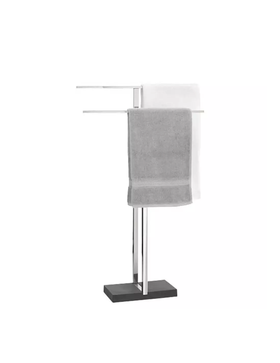 Porte-serviette sur pied au design très moderne, constitué de deux repose-serviettes en inox en forme de T de hauteurs légèrement différentes pour en faciliter l'usage. Le pied en Polystone assure une grande stabilité à l'ensemble. Présenté en finition inox poli (aspect brillant).