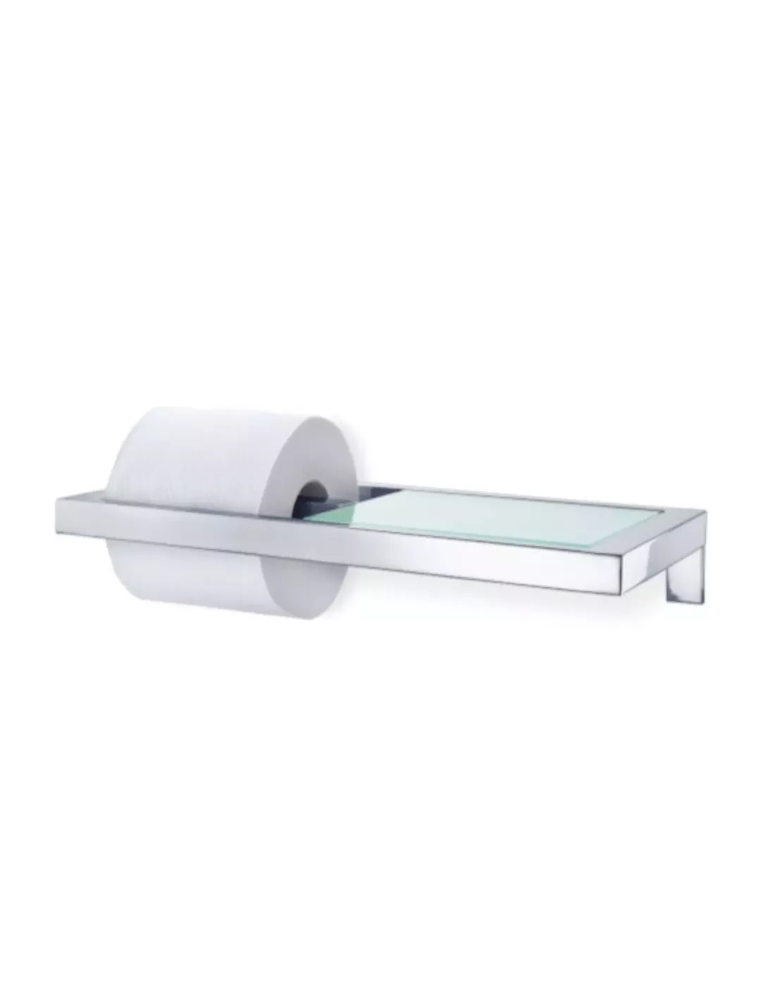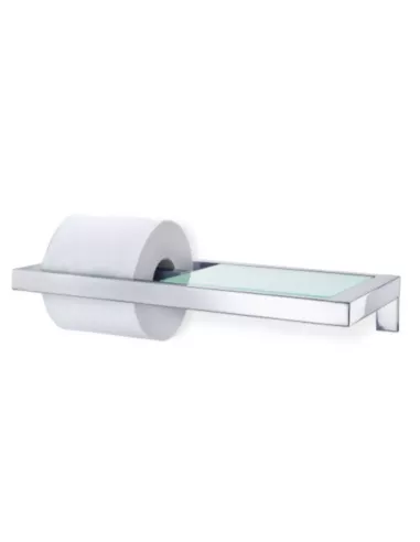 Dérouleur de papier WC en acier inoxydable poli avec une tablette en verre dépoli.