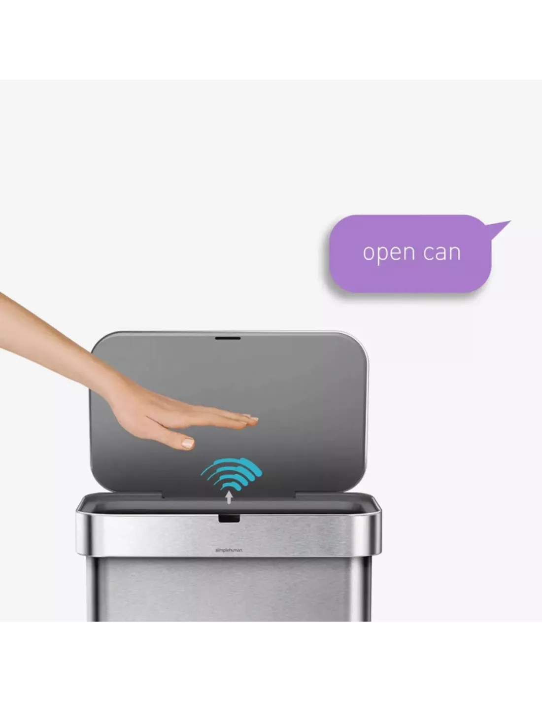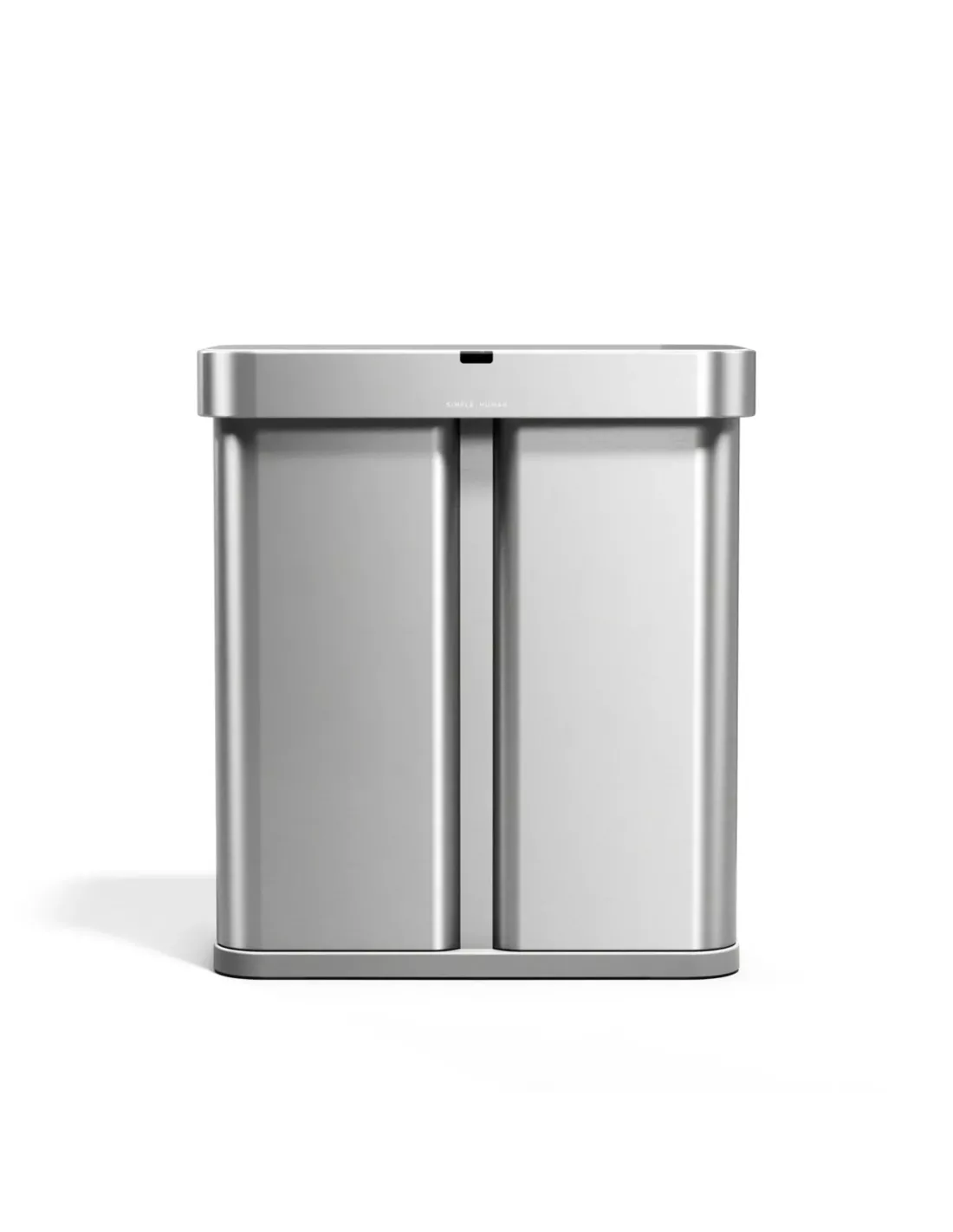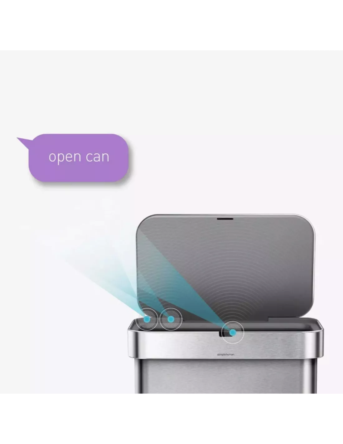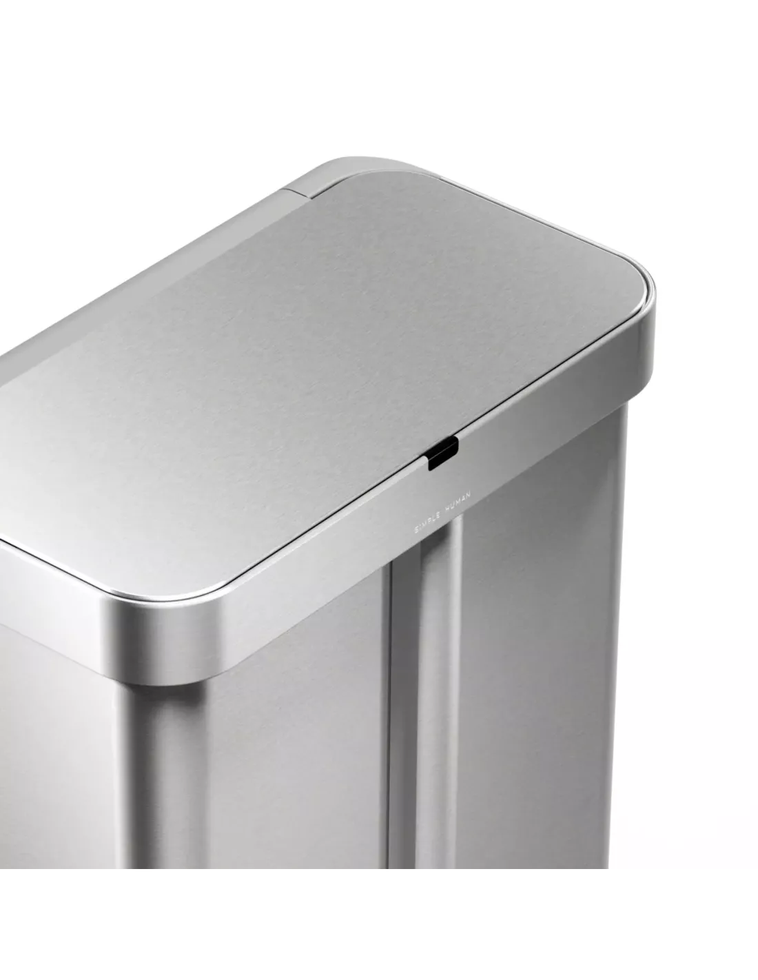 Découvrez la poubelle double compartiment rectangulaire Simplehuman de 58 litres (34 + 24 litres), équipée d'un capteur intelligent avec détection vocale et de mouvement pour une gestion des déchets sans contact, moderne et pratique.