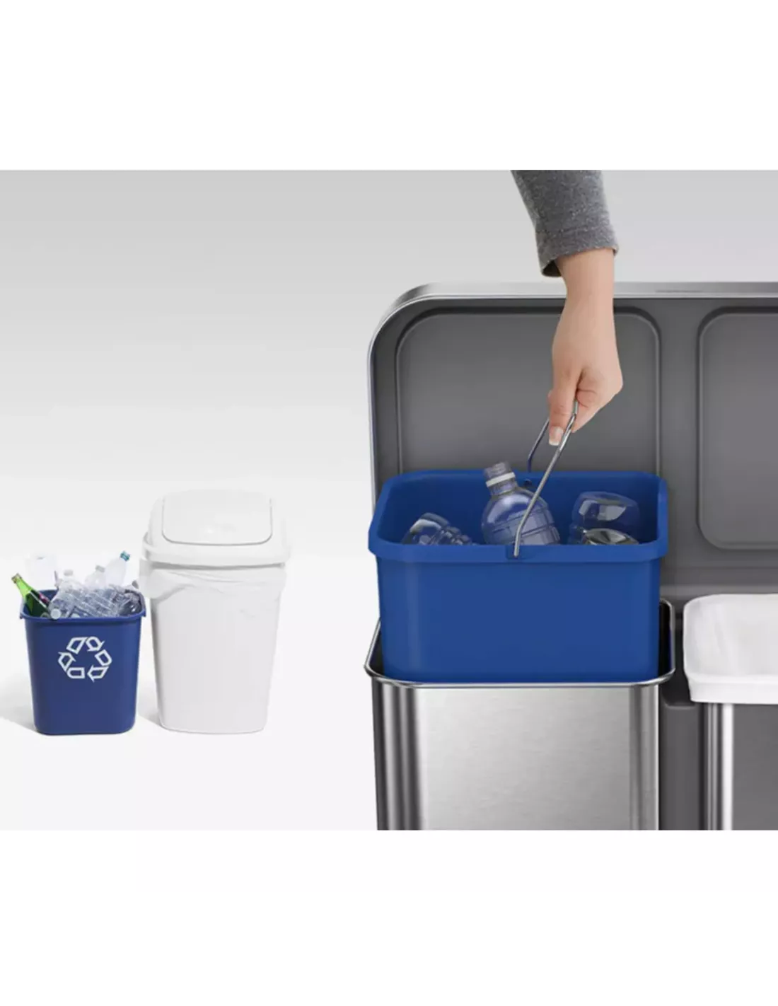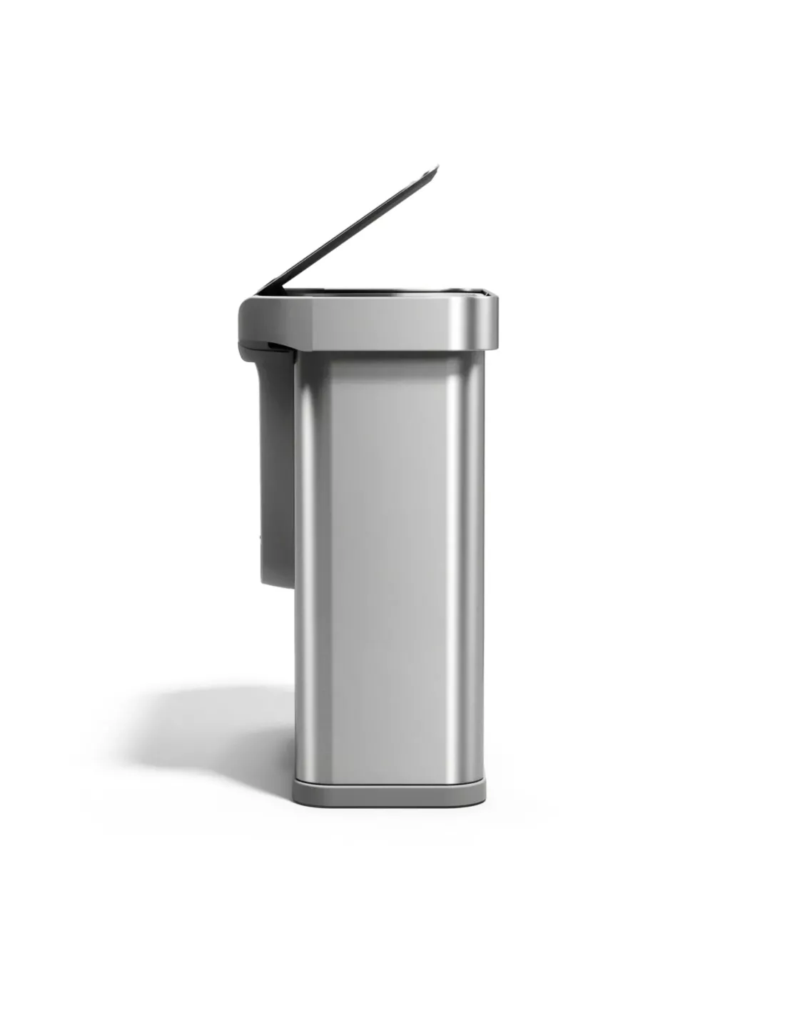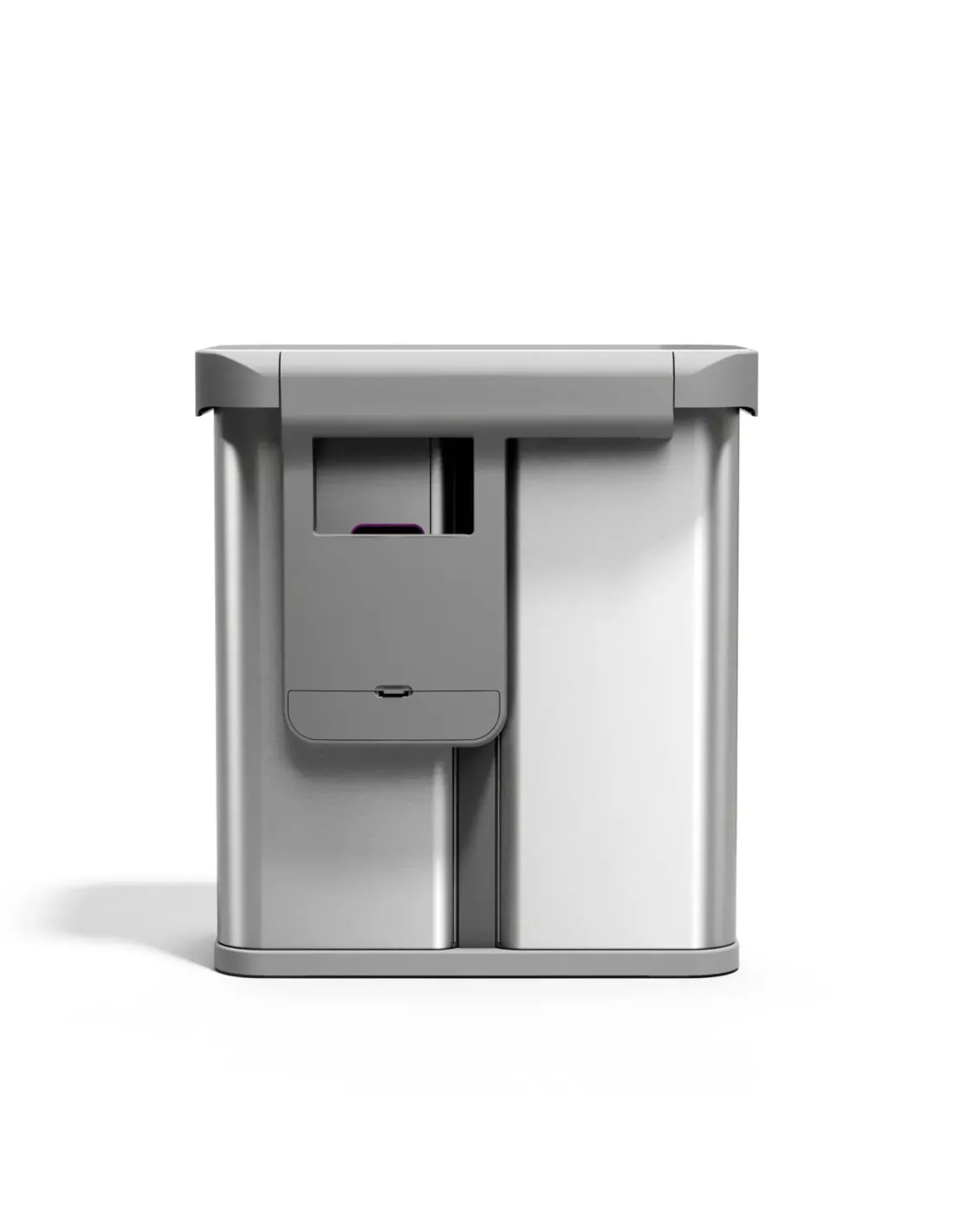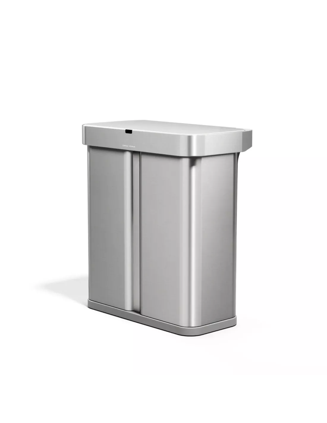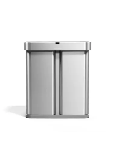 Découvrez la poubelle double compartiment rectangulaire Simplehuman de 58 litres (34 + 24 litres), équipée d'un capteur intelligent avec détection vocale et de mouvement pour une gestion des déchets sans contact, moderne et pratique.
