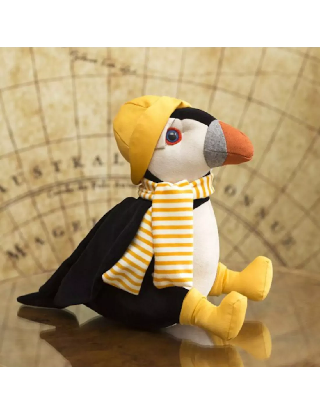Habillé de velours noir et de faux daim blanc, il affiche un style marin unique avec ses bottes, son écharpe rayée et son chapeau jaune.