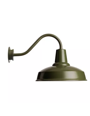 Le corps en aluminium vert kaki déborde du mur de 53 cm et offrira donc, avec son abat-jour de 36 cm de diamètre, un éclairage amplement diffusé, renforcé par la teinte blanche de la partie intérieure.