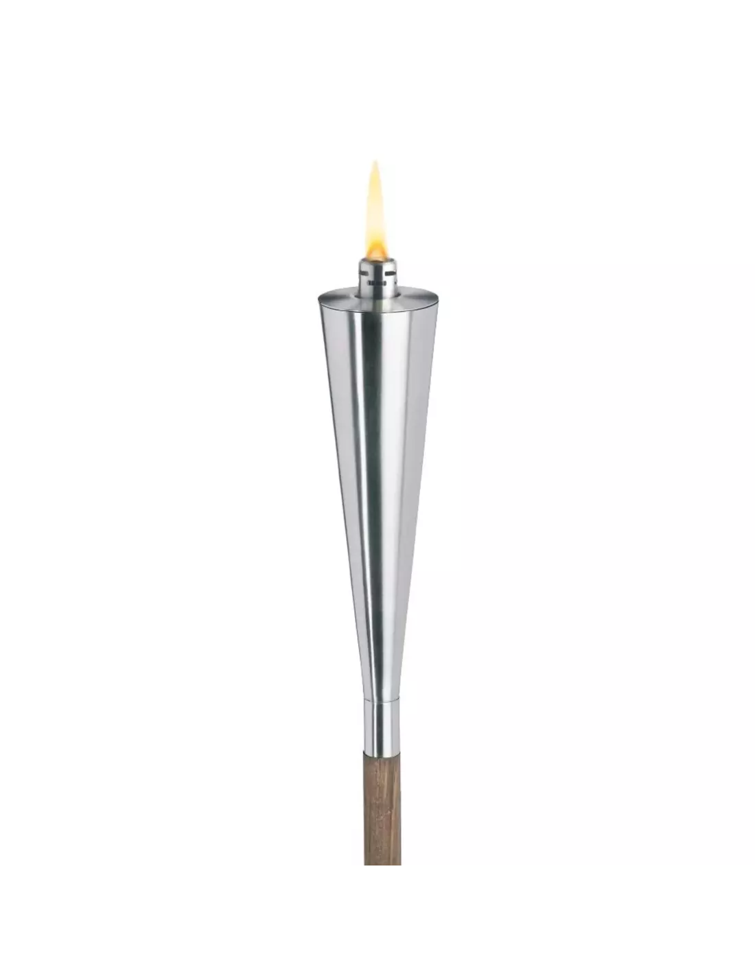 Torche de jardin Orchos de la marque Blomus sur pied, en deux parties composée d'un pied en bois et d'un réservoir en inox brossé mat.