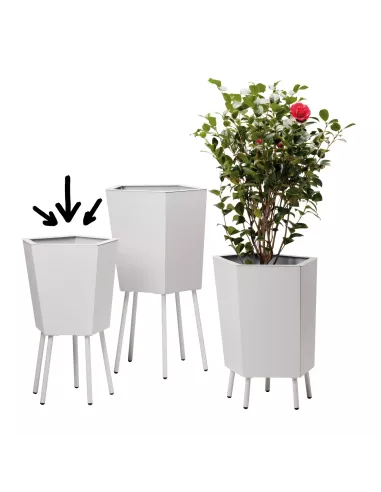 Pot de fleurs en métal monté sur pieds, Gamme Elévation de la marque Flora, dessin hexagonal asymétrique. Hauteur 81cm. Structure aluminium Blanc