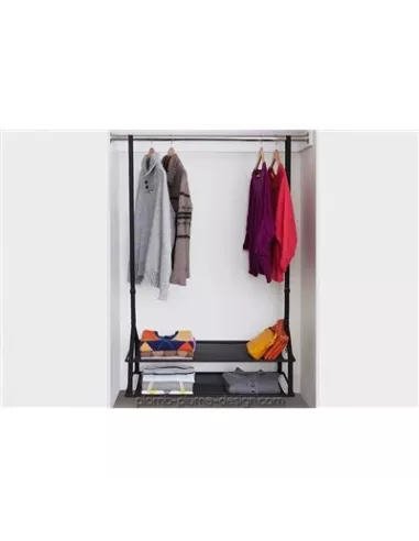 Meuble de rangement à chaussures de couleur noire composé de deux étagères en tissu munies de sangles ajustables, destinées à être suspendues à une penderie pour occuper l'espace au sol laissé par les vêtements.