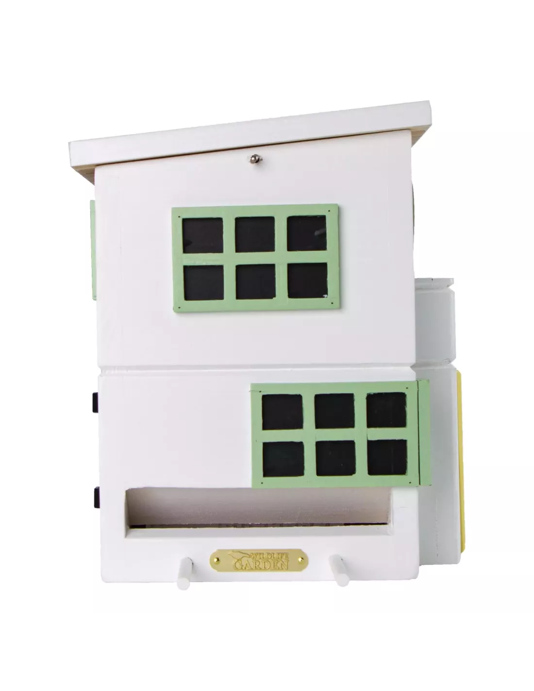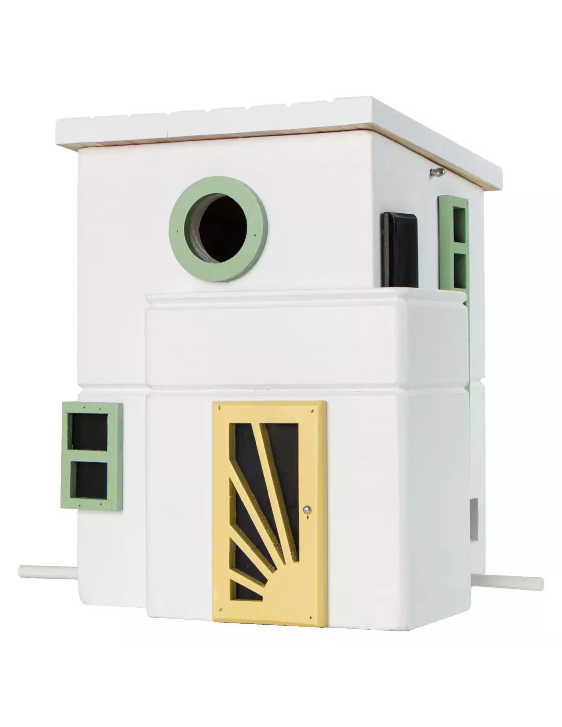Ce nichoir en bois pour petits oiseaux peint d'une peinture écologique est inspirée des résidences et hôtels que l'on retrouve sur Ocean Drice à Miami Beach en Floride. D'un Design Art Deco, elle fait aussi fonction de mangeoire en hiver pour les petits oiseaux.