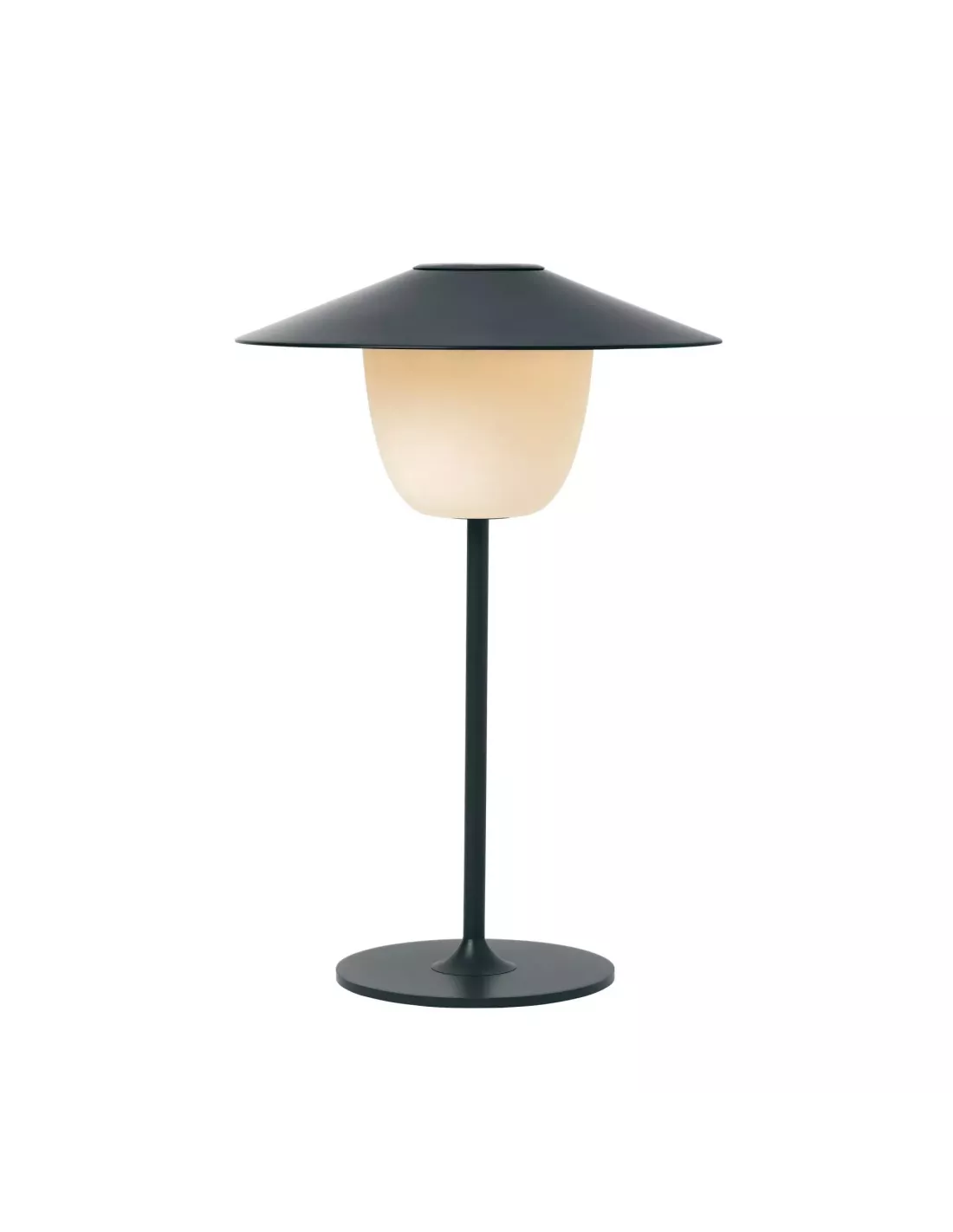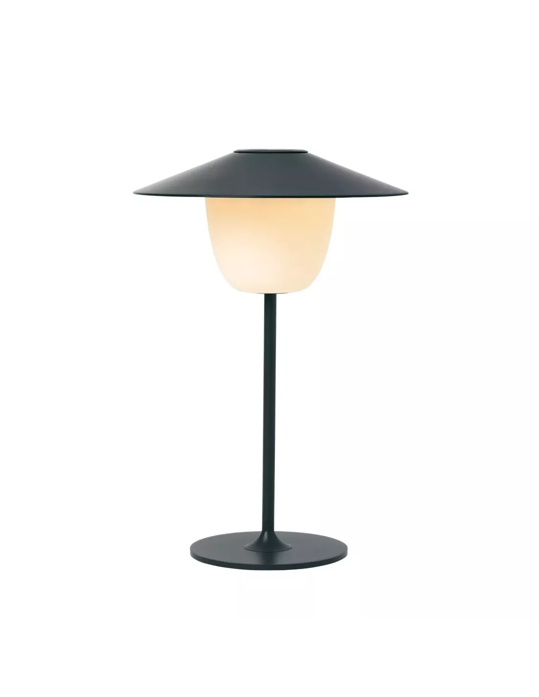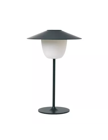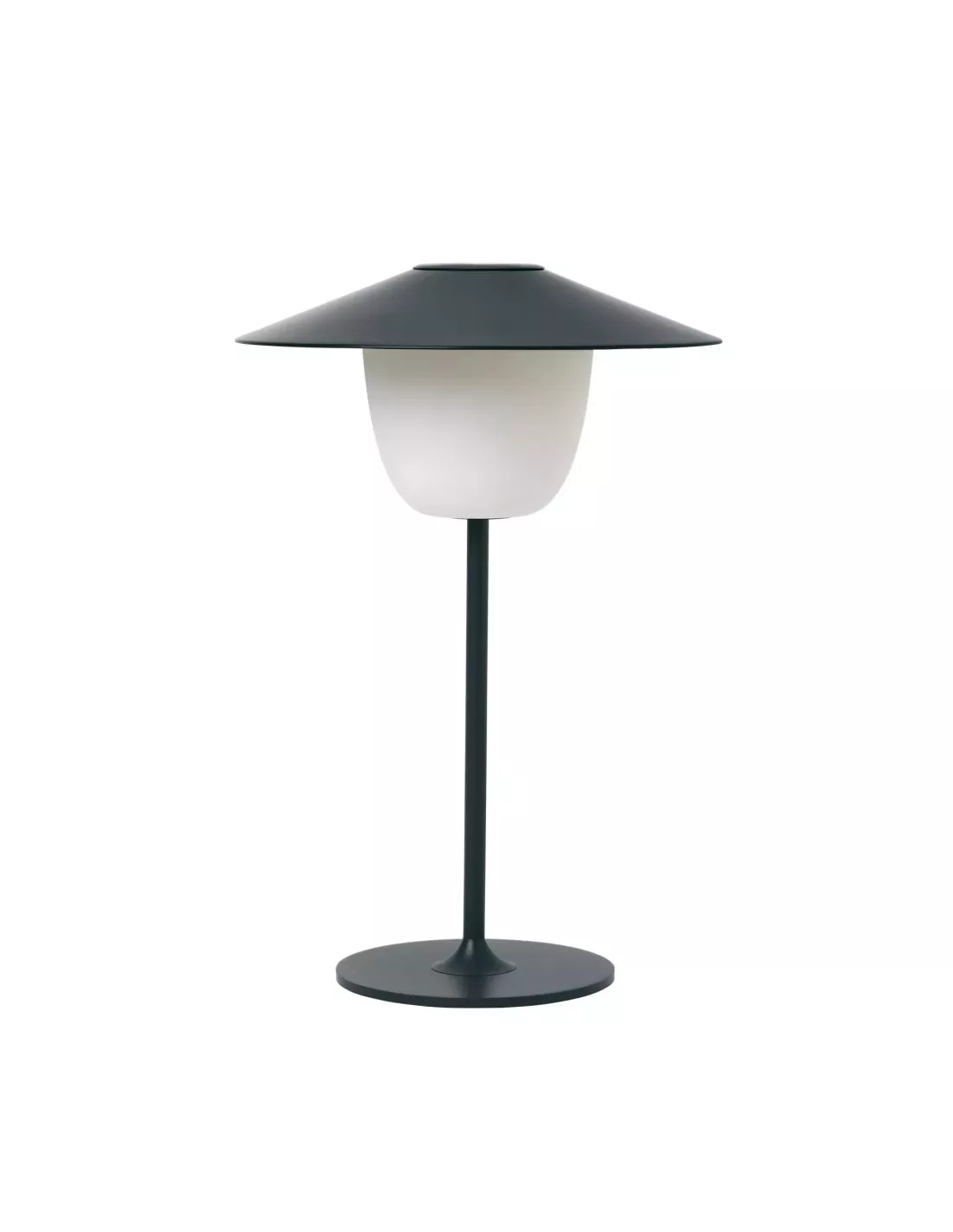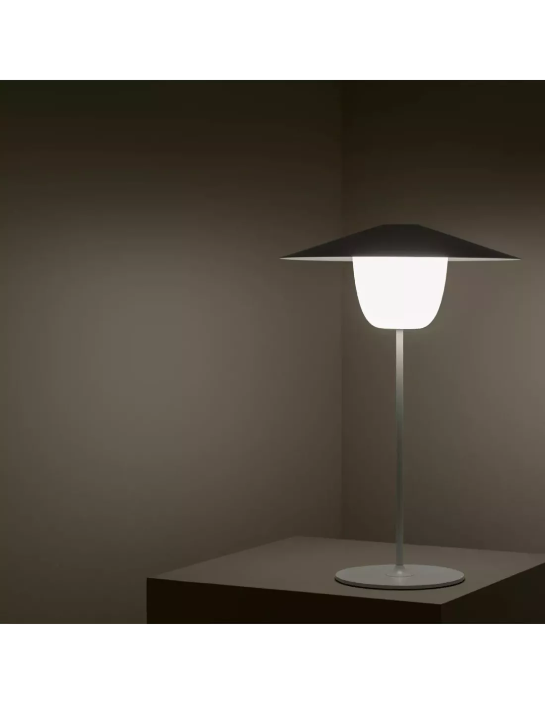 La lampe LED mobile ANI LAMP avec pied est fabriquée en aluminium pulvérisé gris foncé et mat et est parfaitement emboîtable avec une batterie intégrée.