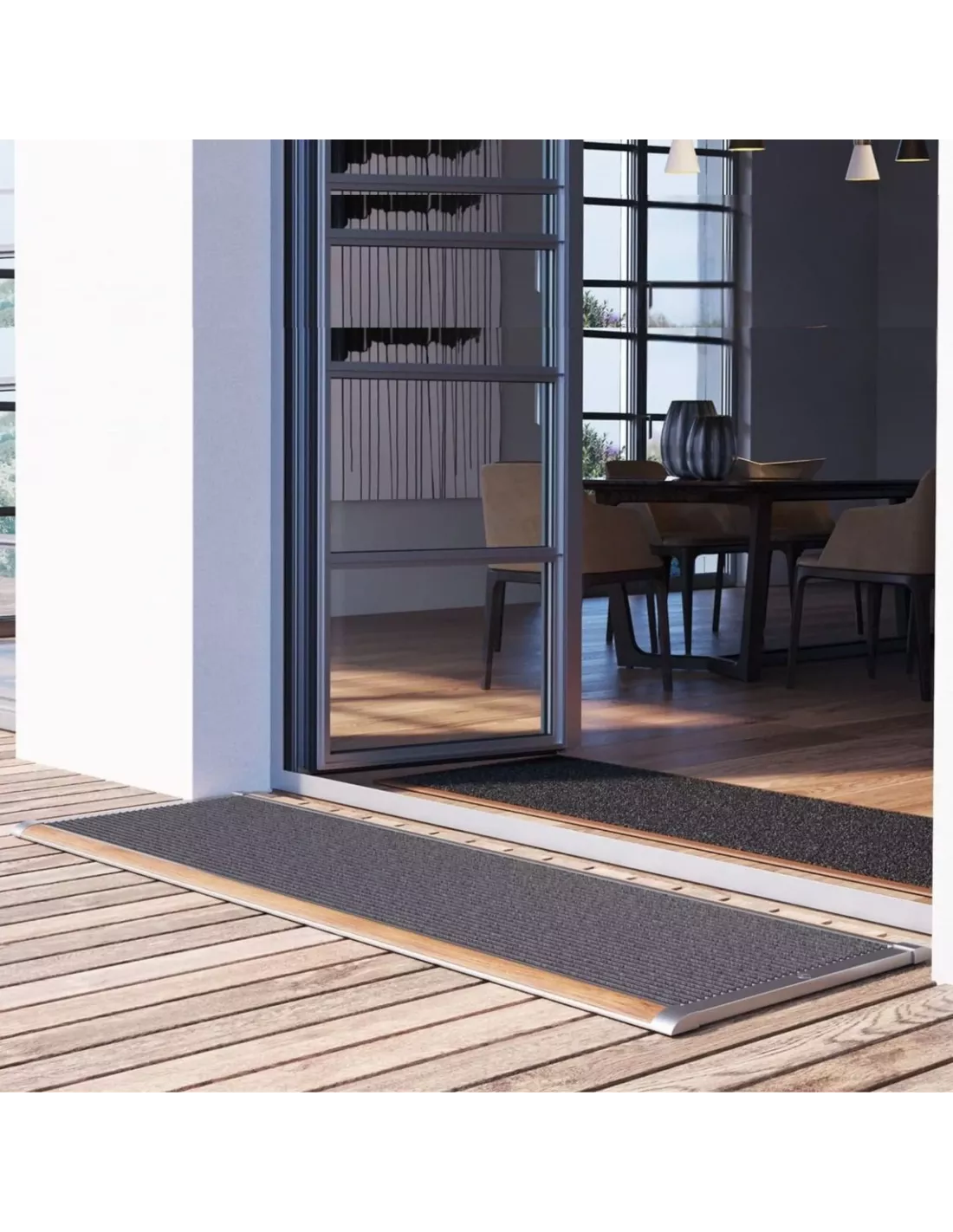 Paillasson d'extérieur réalisé en aluminium aux finitions très soignées, il est garni d'un tapis brosse de qualité professionnelle. Présenté ici dans sa version bi-matières (teck et aluminium anodisé) et en dimensions 175 x 70 cm.