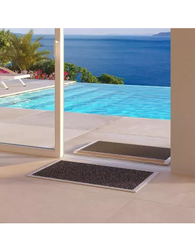 Paillasson d’intérieur doté d’un dessous en cuir et d’une surface en fibre haute performance, jusqu’à 300 % plus absorbante, au format 90 x 60 cm.