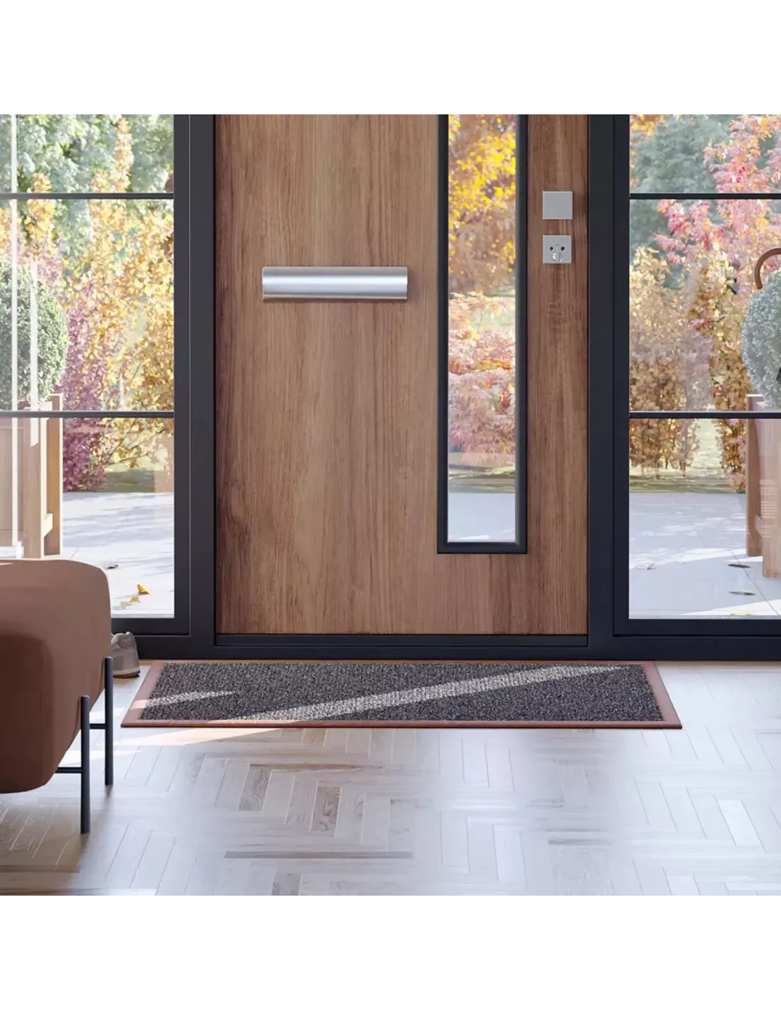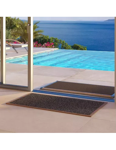 Paillasson d’intérieur doté d’un dessous en cuir et d’une surface en fibre haute performance, jusqu’à 300 % plus absorbante, au format 120 x 70 cm.
