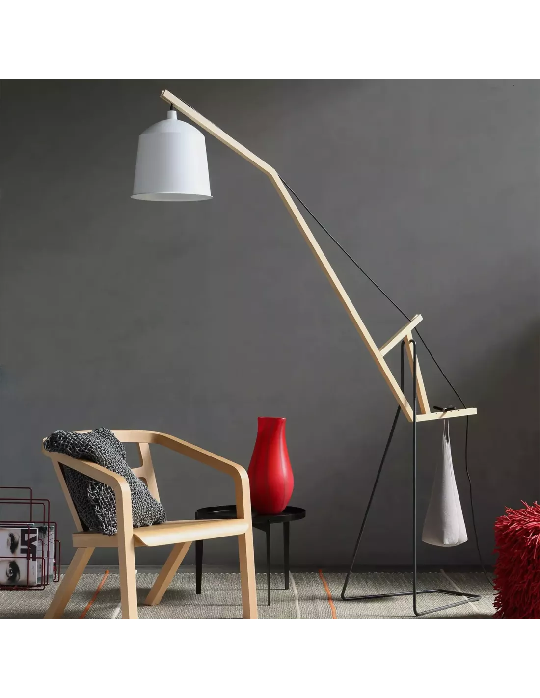 Son bras en bois, de frêne fonctionne comme une balance : d'un côté, un abat-jour en coton diffusant une lumière douce, de l'autre, un sac de sable faisant office de contrepoids.