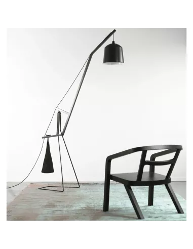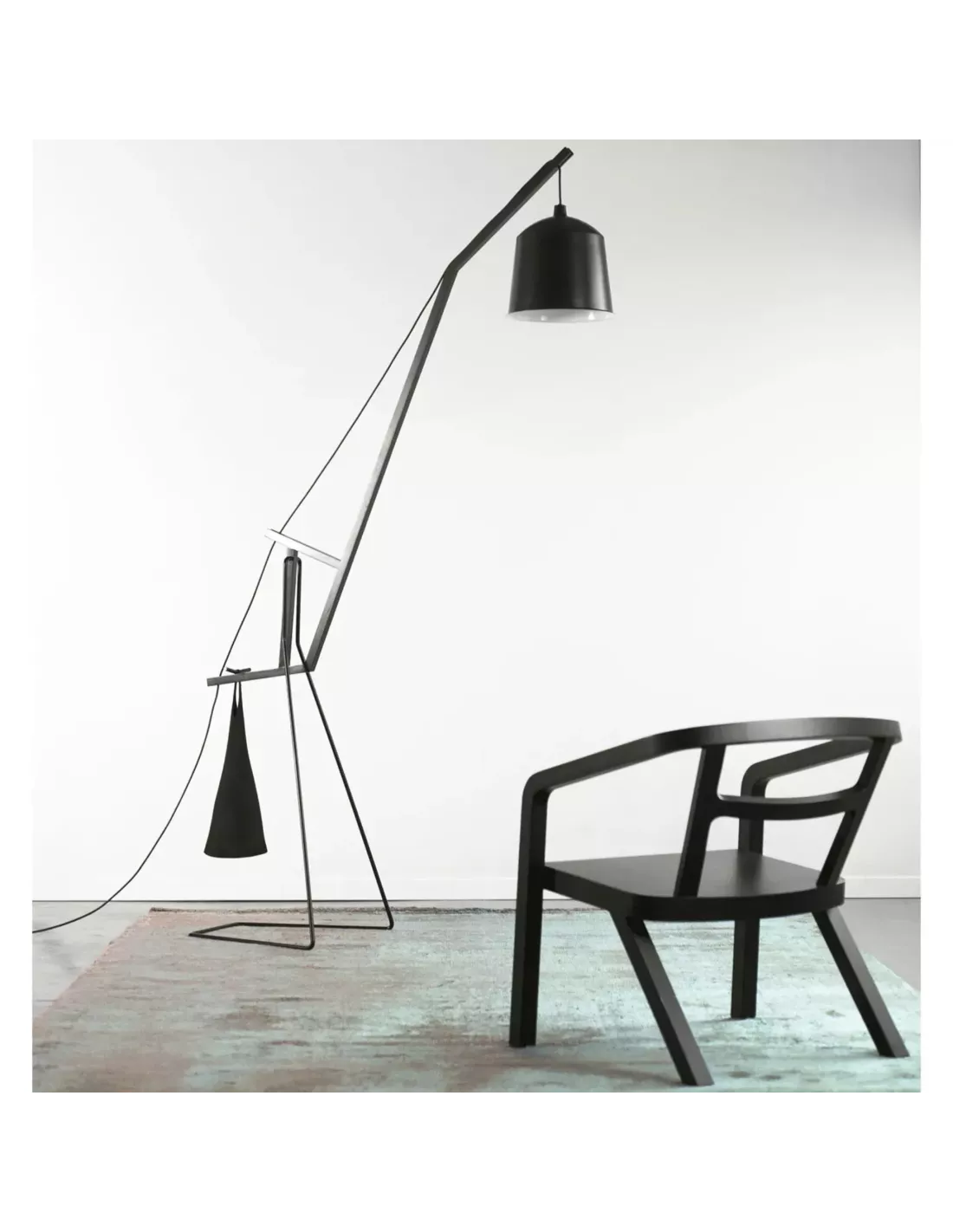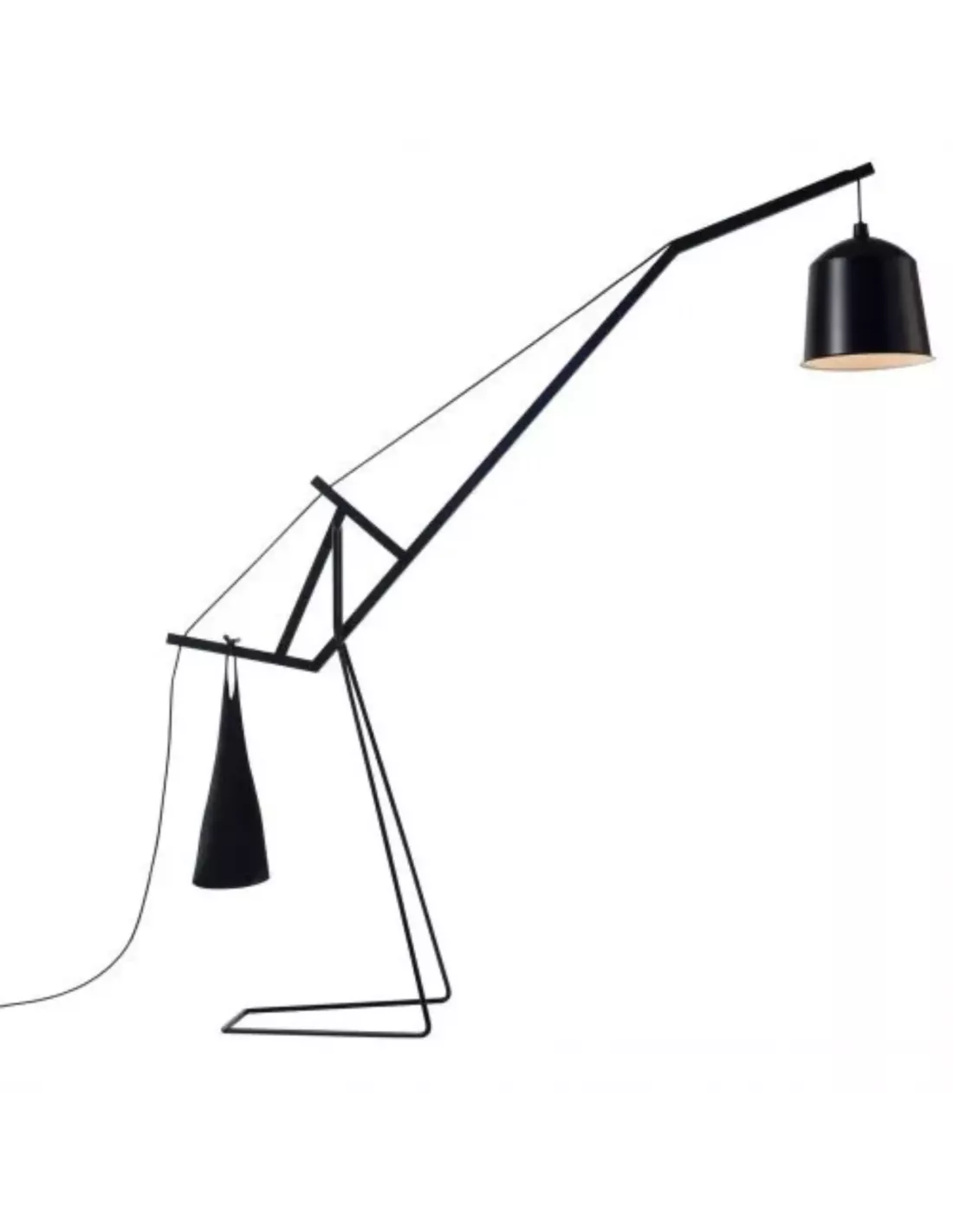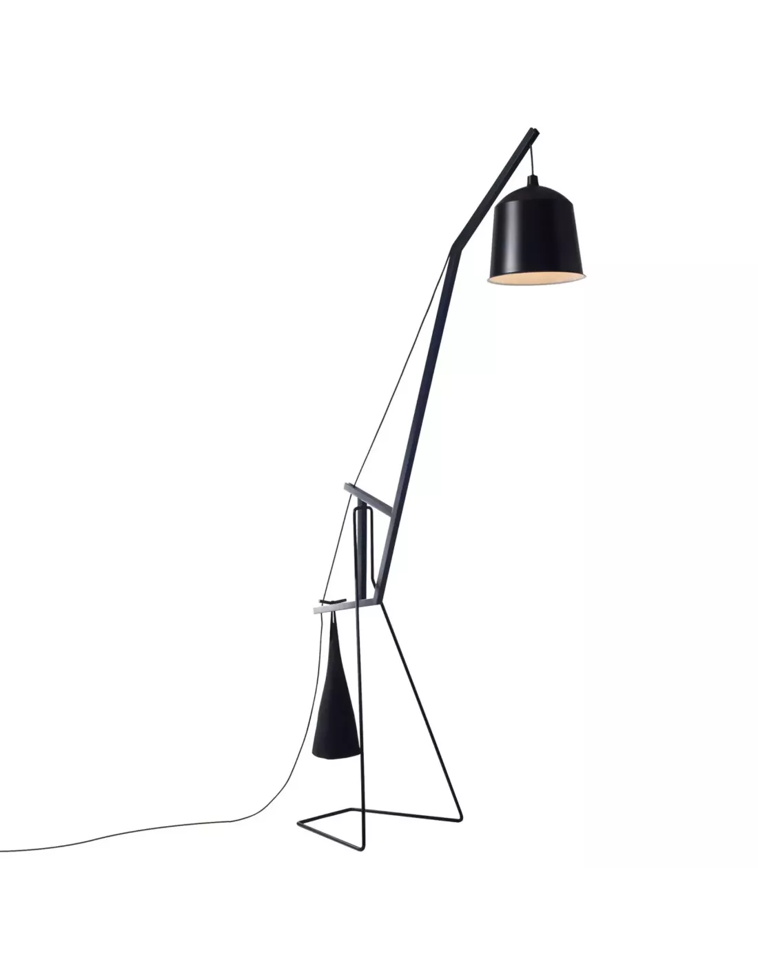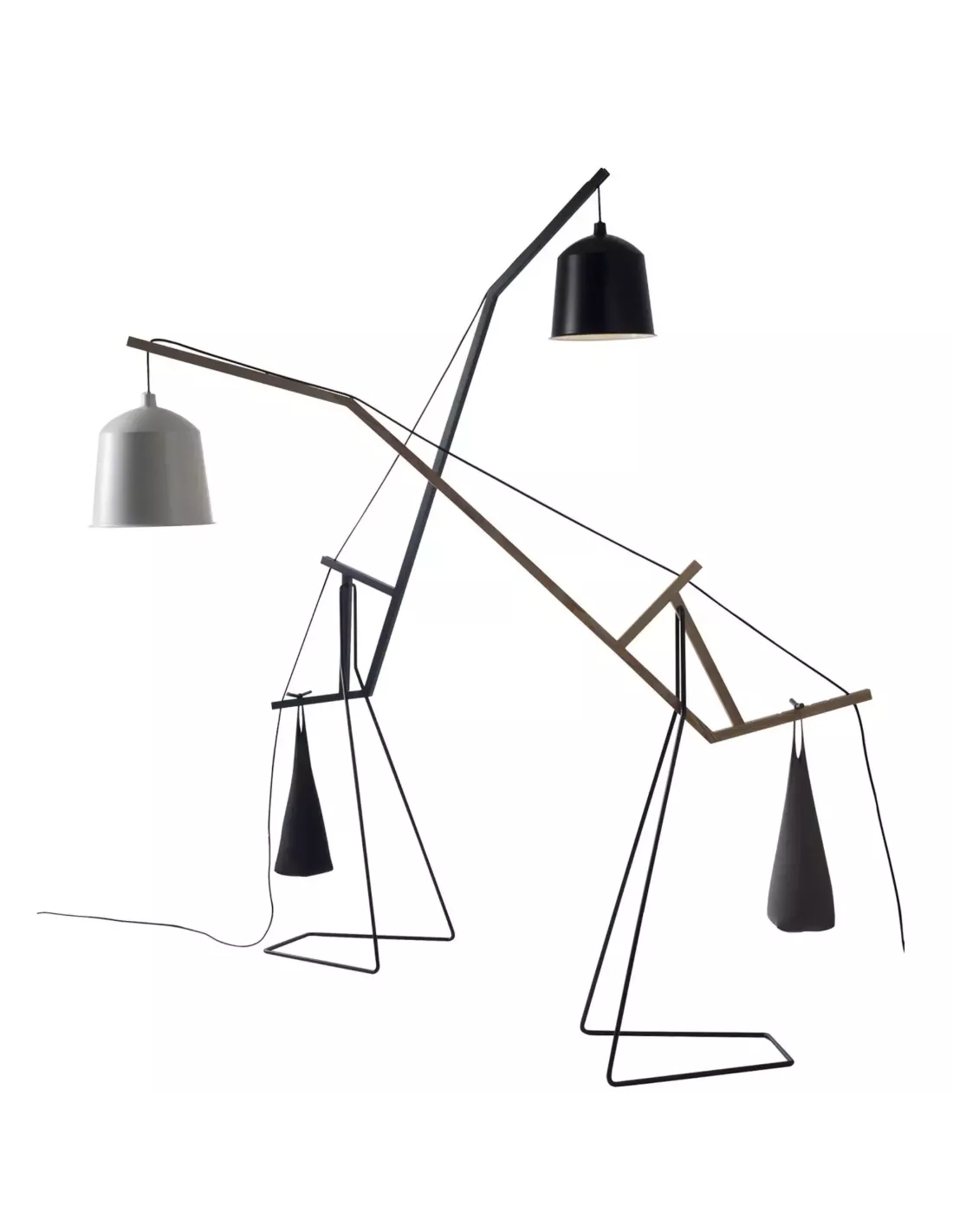 Son bras en bois, de frêne fonctionne comme une balance : d'un côté, un abat-jour en coton diffusant une lumière douce, de l'autre, un sac de sable faisant office de contrepoids.