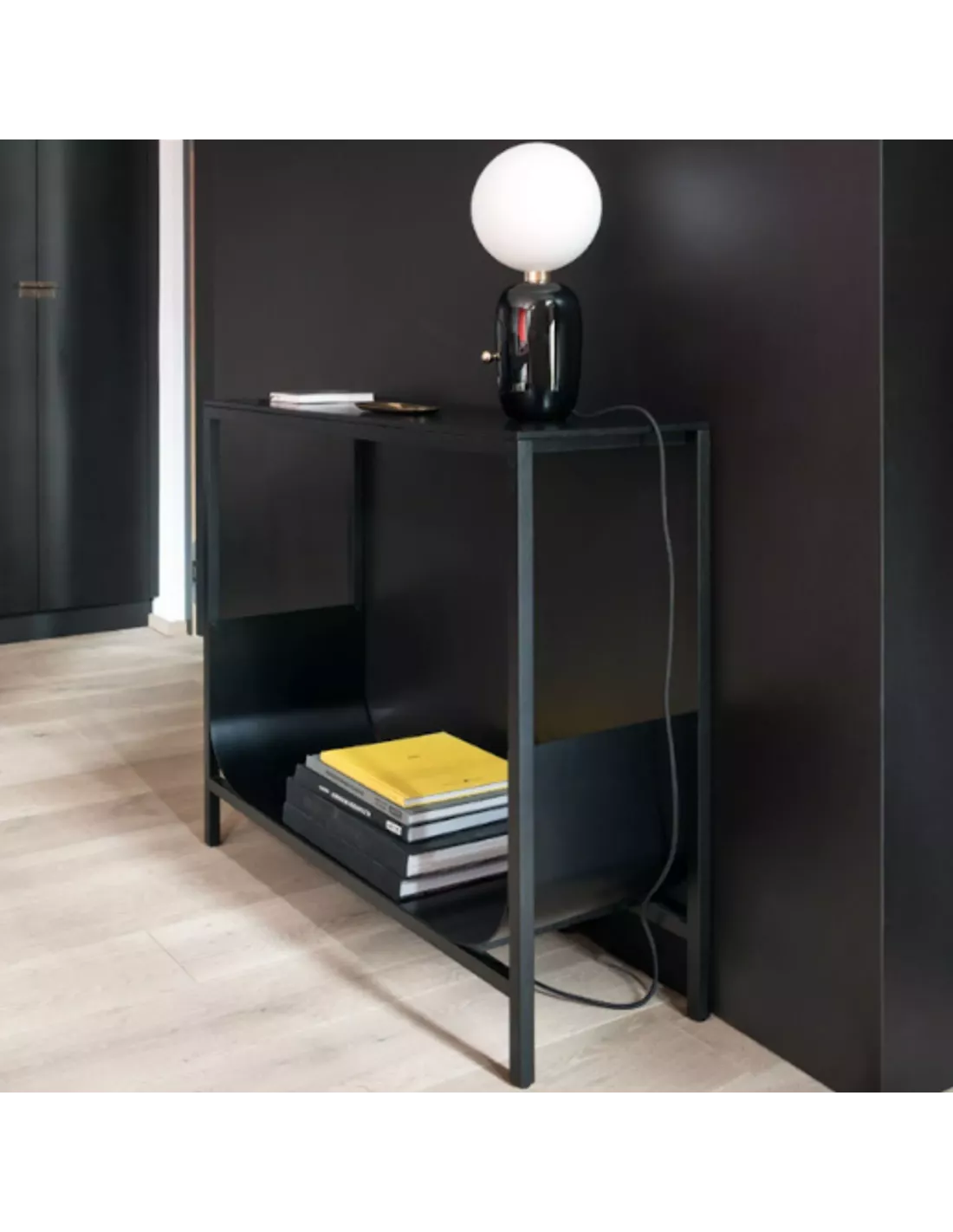 Ce modèle est aussi disponible en version noire laquée à pores ouverts, avec une étagère assortie.