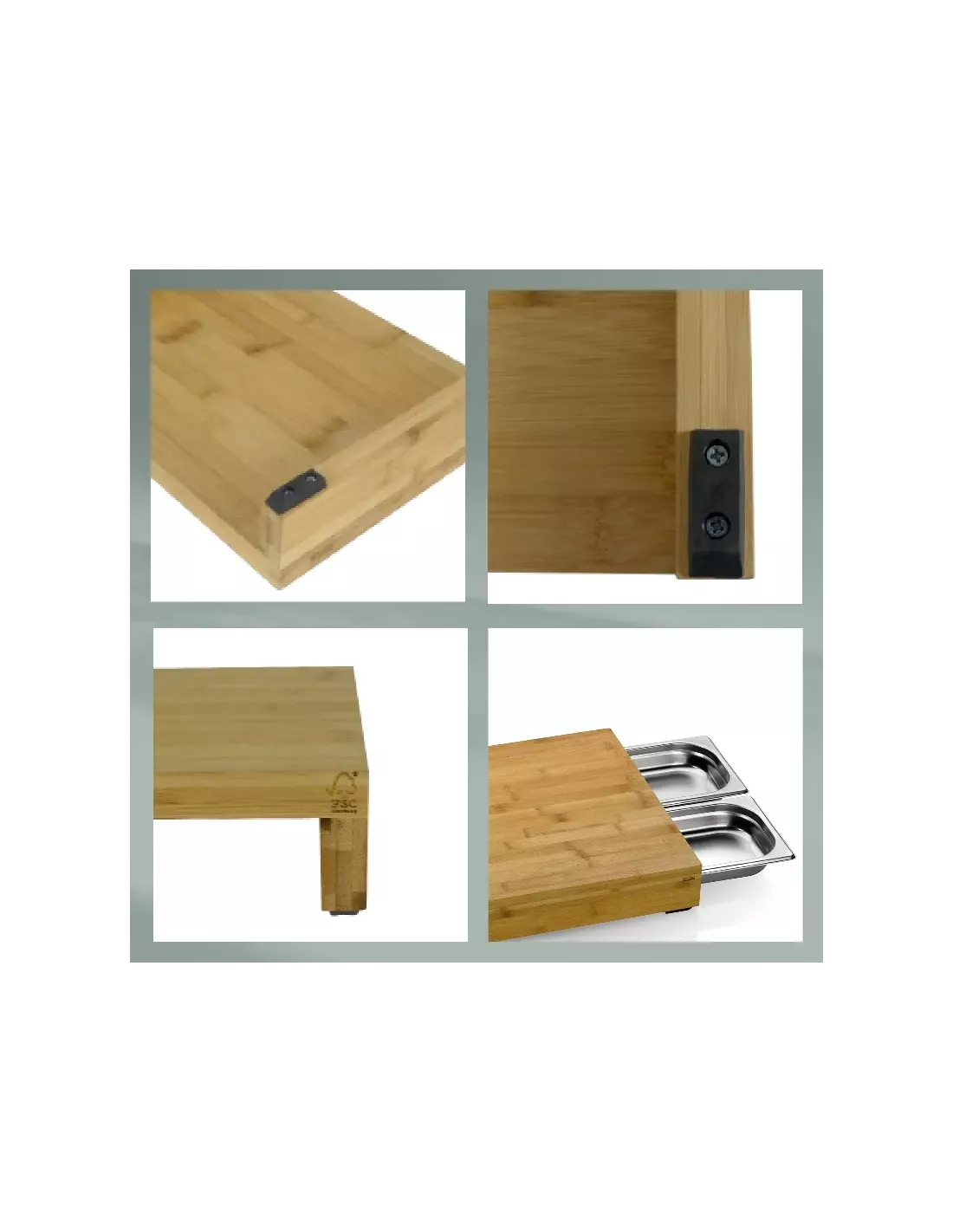 Cette planche est équipée de 3 récipients intégrés en acier inoxydable (récipients Gastronorm) de 2 tailles différentes. Ces récipients utiles et de qualité supérieure se glissent à l'intérieur et à l'extérieur et peuvent également être utilisés comme plat à four !