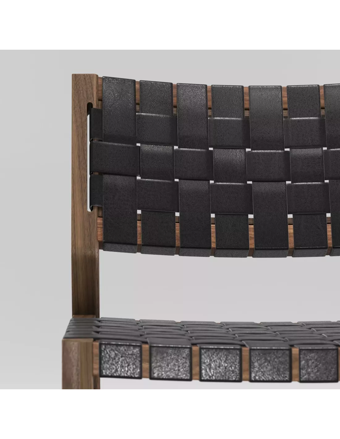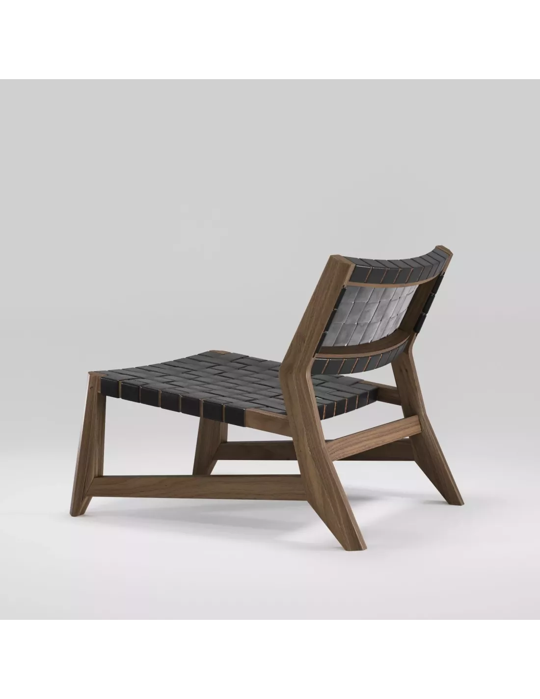 Réalisée en bois de Noyer massif, sa structure révèle la beauté naturelle du grain, patiemment poli pour un toucher soyeux. L’assise, composée de larges sangles de cuir de haute qualité, combine souplesse et maintien avec une sophistication rare. L’assemblage, volontairement visible, souligne l’harmonie entre robustesse et esthétisme, garantissant une longévité qui transforme Odhin en héritage plutôt qu’en simple mobilier.