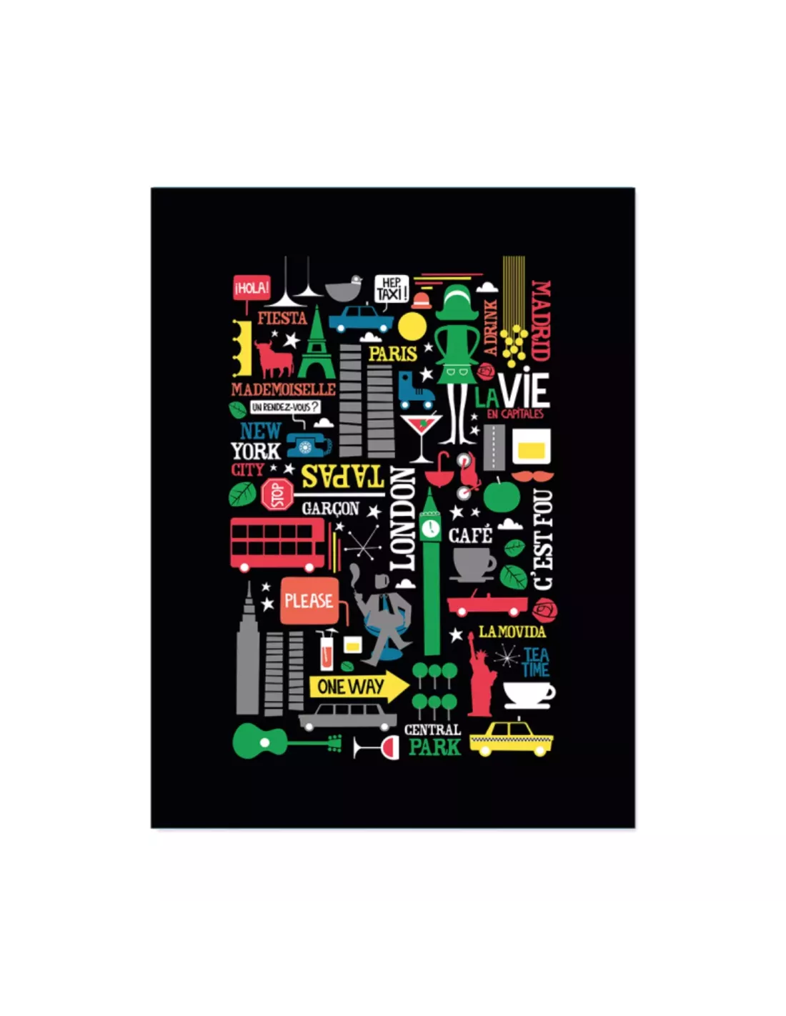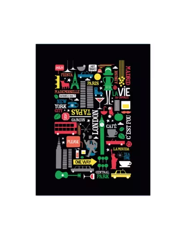 Jeux de mots, mise en page travaillée et graphisme moderne en font une pièce forte pour un salon, un bureau ou une chambre d’ado.